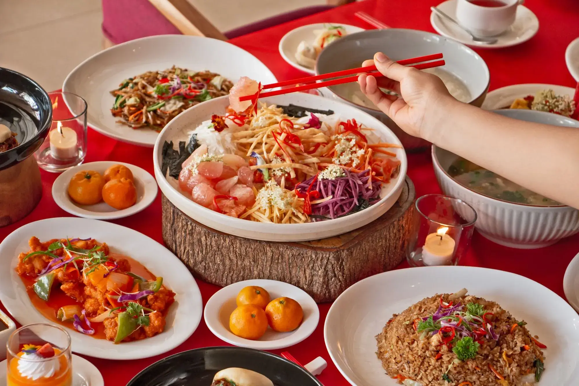 Begin your celebration with our traditional Yee Shang Salad, a symbolic dish featuring dumpling wrappers, taro, jicama, daikon, carrot, pomelo, cilantro, pickled ginger, and smoked salmon, tossed with hoisin apricot dressing.